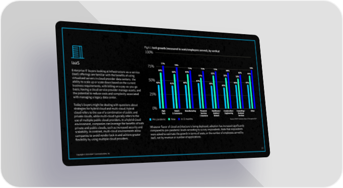 Fig 6.1 IaaS growth (measured in seats/employees served), by vertical IaaS Enterprise IT buyers looking at Infrastructure-as-a-service (IaaS) o昀昀erings are familiar with the benefits of using virtualized servers in cloud provider data centers: the ability to scale up or scale down based on the current business requirements, with billing on a pay-as-you-go basis; having a cloud service provider manage assets; and the potential to reduce costs and complexity associated with managing a legacy data center. Today’s buyers might be dealing with questions about strategies for hybrid cloud and multi-cloud. Hybrid cloud refers to the use of a combination of public and private clouds, while multi-cloud typically refers to the use of multiple public cloud providers. In a hybrid cloud Source: AVANT Analytics State of Disruption 2024 environment, companies can leverage the benefits of both private and public clouds, such as increased security and Whatever flavor of cloud architecture is being deployed, adoption has increased significantly scalability. In contrast, multi-cloud environments allow compared to pre-pandemic levels according to survey respondents. Note that respondents companies to avoid vendor lock-in and achieve greater were asked to estimate the growth in terms of seats, or the number of employees served by flexibility by using multiple cloud providers. IaaS, not by revenue or number of applications. Copyright © 2024 AVANT Communications, Inc. 19