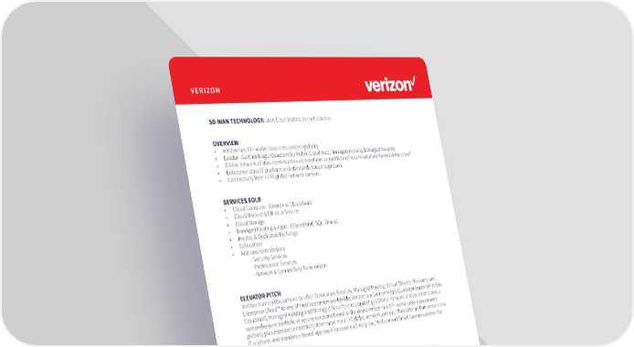 VERIZON SD-WAN TECHNOLOGY: Uses Cisco Viptela, Versa Networks OVERVIEW • Verizon has 57+ world-class data centers globally • Leader - Gartner Magic Quadrant for Public Cloud IaaS; Managed Hosting; Managed Security • Global network of data centers and a comprehensive portfolio of secure solutions based in the cloud • Enterprise-class IT platform and standards-based approach. • Connectivity from >170 global network carriers. SERVICES SOLD • Cloud Compute - Enterprise Cloud/IaaS • Cloud Backup & DR-as-a-Service • Cloud Storage • Managed Hosting & Apps - (SharePoint, SQL, Oracle) • Hosted & Dedicated Exchange • Colocation • Add-ons from Verizon: - Security Services - Professional Services - Network & Connectivity from Verizon ELEVATOR PITCH Verizon teams with partners to offer: Colocation Services, Managed Hosting, Virtual Disaster Recovery and Enterprise Cloud™ to any of their customers worldwide. Verizon is a Gartner Magic Quadrant leader for Public Cloud IaaS, Managed Hosting and Managed Security encompassing a Global network of data centers and a comprehensive portfolio of secure solutions based in the cloud.Verizon has 57+ world-class data centers globally plus massive connectivity from more than 170 global network carriers. They offer an Enterprise-class IT platform and standards-based approach focused on Enterprise, Medium and Small business across the globe. KEY FEATURES & DIFFERENTIATORS • Built on Enterprise-class equipment from major manufacturers like Cisco, HP, NetApp, and EMC • Deployed in Network Access Points and Cloud-Enabled Data Centers across the United States, Latin America, EMEA and APAC • Delivered with a sophisticated web-based management console AND a comprehensive set of RESTful APIs • Virtual private cloud architecture, including private compute pools with guaranteed resource availability and meaningful SLAs • Support for Hybrid Solutions, including dedicated devices, integration of IT and Security services, and connections to private clouds, internal data centers, and other cloud providers • Secure cloud architecture with proven ability to meet critical commercial and government compliance standards • Provided on VMware-based products, insuring support for the broadest range of operating systems and business applications