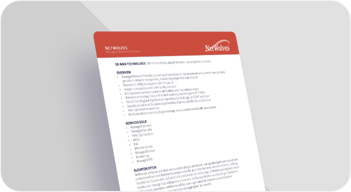 NETWOLVES Managed Network Provider SD-WAN TECHNOLOGY: Offers Cisco Meraki, BigLeaf, Riverbed, and proprietary solutions OVERVIEW • Managed Network Provider, delivering consolidated and secure network services from leading facility providers, network management, monitoring and professional services • Founded in 1998, headquartered in Tampa, FL • Vendor relationships with 175+ facility providers • FCC Licensed Common Carrier in all 50 states with international reach • Patented technology: Secure Remote Monitoring and Management® (SRM2) • World Class Engineering/Architect team for network design, all CCNP and above • Security solutions with exclusive partnerships that include IBM Security Services • WAN Optimization solutions • Professional services including technology reviews and network health assessments SERVICES SOLD • Managed Services • Managed Security • WAN Optimization • MPLS • DIA • Ethernet Access • Managed Failover • Monitoring • Managed VPN ELEVATOR PITCH NetWolves’ principal activities are to custom design, deliver and manage intelligent communications products and services that enable companies to focus on their business, not their network. Utilizing multiple facility providers and proprietary processes and technology, NetWolves can engineer, install, monitor and manage rock solid primary networks and backup/failover solutions to give customers 100% service availability. NetWolves will be your single source for network connectivity and management, with all services and locations aggregated into one bill. KEY FEATURES & DIFFERENTIATORS • We simplify network design, support and billing. • NetWolves’ agreements with over 175 facility providers allow us to aggregate multiple networking sources through a single bill. • Our monitoring and management solutions provide real time visibility into all locations and devises, providing powerful network management and control. • Our custom designed primary and backup network solutions allow companies to control their data communication investment without compromising service quality or redundancy • Secure and diverse automatic failover solutions • Overhaul WAN, Internet security and equipment deployment strategies reducing monthly costs and enabling better control of data communications • Implement robust, scalable enterprise quality platforms with management and monitoring tools that provide significant savings