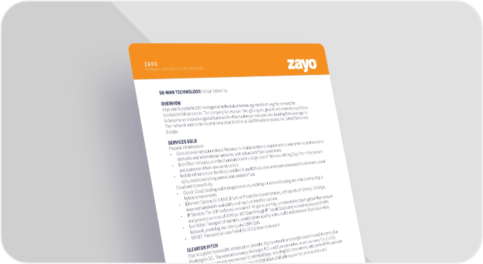 ZAYO Network and Data Center Provider SD-WAN TECHNOLOGY: Versa Networks OVERVIEW Zayo was founded in 2007 in response to favorable technology trends driving the demand for bandwidth infrastructure. The company has evolved through organic growth and network acquisitions to become an innovative global bandwidth infrastructure services provider. Leading firms leverage its fiber network and carrier-neutral colocation facilities at 16,000 locations across the United States and Europe. SERVICES SOLD Physical Infrastructure • Colocation & Interconnections: Presence in 43 data centers in major markets and carrier-neutral access to domestic and international networks, with redundant fiber connections • Dark Fiber: Virtually unlimited bandwidth with a single pair of fibers on existing Zayo fiber infrastructure and customer-driven new construction • Mobile Infrastructure: Backhaul, small cells and DAS on a dense network connected to cell towers, small cells, mobile switching centers and central offices Cloud and Connectivity • Cloud: Cloud, hosting and managed services, enabling on-demand scaling and virtual computing in hybrid environments • Ethernet: Options for E-LINE, E-LAN or Private Dedicated Network, with speeds of 10 Mbps-100 Gbps, reserved bandwidth availability and multiple interface options • IP Services: Tier-1 IP backbone, ranked 5th for global peering, is connected to Zayo’s global fiber network and provides services of 10 Mbps-100 Gbps through IP Transit, Dedicated Internet Access and IP-VPN • Live Video: Transport of real-time, contributions-quality video, audio and data over Zayo’s Live Video Network, providing low latency and 100% QoS • SONET: Transport services from DS3-OC192 in point-to-point ELEVATOR PITCH Zayo is a global bandwidth infrastructure provider. Zayo’s network serves eight countries and 46 states, plus Washington D.C. The network connects the largest U.S. and European cities, as well as many Tier 2-5 U.S. markets. Zayo’s network reaches over 17,400 buildings, including 827 data centers, 488 carrier POPs, and over 10,500 enterprise buildings. Zayo also has 503,000 finishedbillable square feet of colocation and interconnection space. KEY FEATURES & DIFFERENTIATORS Fiber-Based Services • Unlimited scalable bandwidth available in the metro and on intercity routes. Tier 1 IP network with settlement-free peering. Options for physical security. 24/7 NOC. Global Ethernet and IP Reach • 72,800 route miles and 5.1 M fiber miles. 283 markets in 7 countries, 45 states, and Washington, D.C. Extensive Connectivity • 11,800 on-net buildings. 550 carrier hotels/data centers. 513 carrier POPs. 3,000 cell towers. 6,000 enterprise buildings. Diversity to the LEC. Colocation Platform • 21 facilities in 18 markets. Carrier-neutral connections to 700 other networks. 150,000 square feet of billable space