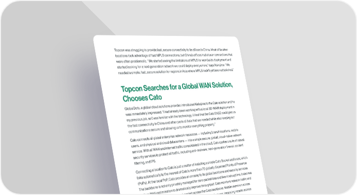 Topcon was struggling to provide fast, secure connectivity to its offices in China. Most of its other locations took advantage of fast MPLS connections, but China’s offices had slower connections that were often problematic. “We started seeing the limitations of MPLS for worldwide deployment and started looking for a next generation network we could deploy everywhere,” says Nakajima. “We needed a simple, fast, secure solution for regions in Asia where MPLS hadn’t yet been established.” Topcon Searches for a Global WAN Solution, Chooses Cato GlobalDots, a global cloud solutions provider, introduced Nakajima to the Cato solution and he was immediately impressed. “I had already been working with a local SD-WAN deployment in my previous job, so I was familiar with the technology. I liked that the Cato SASE could give us the fast connectivity in China and other parts of Asia that we needed while also keeping our communications secure and allowing us to monitor everything properly.” Cato connects all global enterprise network resources — including branch locations, mobile users, and physical and cloud datacenters — into a single secure, global, cloud-native network service. With all WAN and Internet traffic consolidated in the cloud, Cato applies a suite of robust security services to protect all traffic, including anti-malware, next-generation firewall, content filtering, and IPS. Connecting a location to Cato is just a matter of installing a simple Cato Socket appliance, which links automatically to the nearest of Cato’s more than 75 globally dispersed Points of Presence (PoPs). At the local PoP, Cato provides an onramp to its global backbone and security services. The backbone is not only privately managed for zero packet loss and five nine’s uptime; it also has built-in WAN optimization to dramatically improve throughput. Cato monitors network traffic and selects the optimum path for each packet across the Cato backbone. Mobile users run across the same backbone, benefiting from the same optimization features, improving remote access performance. Nakajima was sold on Cato, but convincing internal management was another story. “We had a lot of conversations in which I had to explain Cato and SD-WAN to management and field staff and assure them that I couldn’t find anything else with all the built-in security and monitoring that Cato had,” says Nakajima. “I made those features the big selling points and got it though the internal approval process.” We had a lot of conversations in which I had to explain Cato and SD-WAN to management and 昀椀eld sta昀昀 and assure them that I couldn’t 昀椀nd anything else with all the built-in security and monitoring that Cato had.” Cato. Ready for Whatever’s Next Case Studies - Healthcare 4