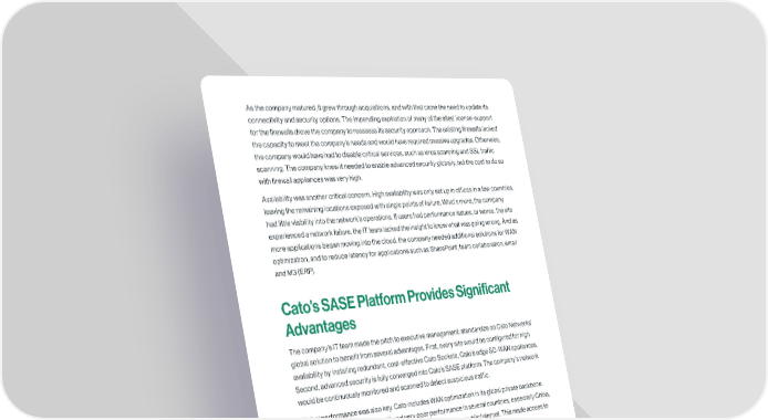 As the company matured, it grew through acquisitions, and with that came the need to update its connectivity and security options. The impending expiration of many of the sites’ license-support for the firewalls drove the company to reassess its security approach. The existing firewalls lacked the capacity to meet the company’s needs and would have required massive upgrades. Otherwise, the company would have had to disable critical services, such as virus scanning and SSL traffic scanning. The company knew it needed to enable advanced security globally, but the cost to do so with firewall appliances was very high. Availability was another critical concern. High availability was only set up in offices in a few countries, leaving the remaining locations exposed with single points of failure. What’s more, the company had little visibility into the network’s operations. If users had performance issues, or worse, the site experienced a network failure, the IT team lacked the insight to know what was going wrong. And as more applications began moving into the cloud, the company needed additional solutions for WAN optimization, and to reduce latency for applications such as SharePoint, team collaboration, email and M3 (ERP). Cato’s SASE Platform Provides Signi昀椀cant Advantages The company’s IT team made the pitch to executive management: standardize on Cato Networks’ global solution to benefit from several advantages. First, every site would be configured for high availability by installing redundant, cost-effective Cato Sockets, Cato’s edge SD-WAN appliances. Second, advanced security is fully converged into Cato’s SASE platform. The company’s network would be continuously monitored and scanned to detect suspicious traffic. Global performance was also key. Cato includes WAN optimization in its global private backbone. By contrast, the existing VPN offered very poor performance in several countries, especially China, Costa Rica, Chile and Ecuador, due to its dependence on the public Internet. This made access to global systems like Office 365 and M3 almost useless. Network visibility was another advantage offered by Cato. The company would now have deep insight into the performance of all last mile connections. Cato provides real-time and historical graphs for throughput, latency, jitter, and packet loss. The company would also have centralized management 24×7 support and monitoring. Finally, there were the cost savings of going with Cato. With Cato’s global private backbone, the company would be able to eliminate all MPLS circuits. And with Cato running security in the cloud, the company would avoid hardware upgrades of its legacy firewalls. Cato. Ready for Whatever’s Next Case Studies - Retail 18