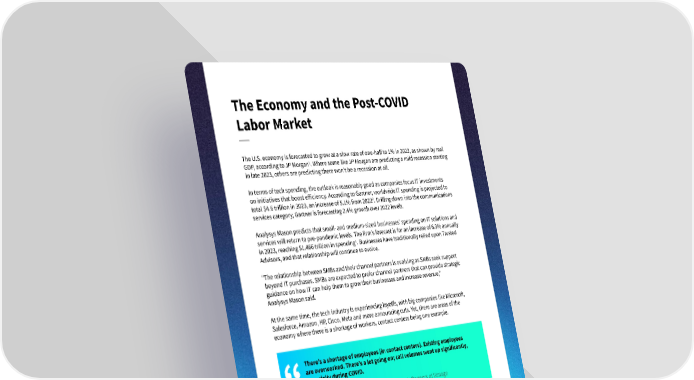 CCaaS 6-12 Report | 5 Copyright © 2023 AVANT Communications, Inc. The Economy and the Post-COVID Labor Market The U.S. economy is forecasted to grow at a slow rate of one-half to 1% in 2023, as shown by real GDP, according to JP Morgan1. Where some like JP Morgan are predicting a mild recession starting in late 2023, others are predicting there won’t be a recession at all. In terms of tech spending, the outlook is reasonably good as companies focus IT investments on initiatives that boost efficiency. According to Gartner, worldwide IT spending is projected to total $4.6 trillion in 2023, an increase of 5.1% from 20222. Drilling down into the communications services category, Gartner is forecasting 2.4% growth over 2022 levels. Analysys Mason predicts that small- and medium-sized businesses’ spending on IT solutions and services will return to pre-pandemic levels. The firm’s forecast is for an increase of 6.3% annually in 2023, reaching $1.466 trillion in spending3. Businesses have traditionally relied upon Trusted Advisors, and that relationship will continue to evolve. “The relationship between SMBs and their channel partners is evolving as SMBs seek support beyond IT purchases. SMBs are expected to prefer channel partners that can provide strategic guidance on how IT can help them to grow their businesses and increase revenue,” Analysys Mason said. At the same time, the tech industry is experiencing layoffs, with big companies like Microsoft, Salesforce, Amazon, HP, Cisco, Meta and more announcing cuts. Yet, there are areas of the economy where there is a shortage of workers, contact centers being one example. There’s a shortage of employees [in contact centers]. Existing employees are overworked. There’s a lot going on; call volumes went up significantly, especially during COVID. - Aqeel Shahid, Vice President of Global Strategic Partners at Vonage “ A survey by Censuswide in 20224 revealed that: • Contact volumes are spiraling beyond the capacity to handle them (66% of respondents). • Two-thirds of respondents say dealing with frustrated customers has impacted employees’ mental health. An uncertain labor market will aid hiring for contact centers to a degree, but the days of staffing hundreds of employees in a central office building are receding. Retaining employees is an ongoing issue in the industry, too. These are significant challenges, but the flexibility of CCaaS systems that inherently consider the “anywhere” agent promise to give employers the tools to offer excellent customer and employee experiences.