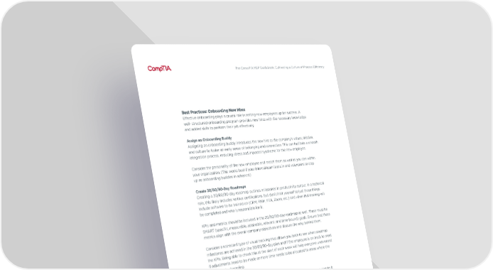 The CompTIA MSP Guidebook: Cultivating a Culture of Process E昀케ciency Best Practices: Onboarding New Hires E昀昀ective onboarding plays a crucial role in setting new employees up for success. A well- structured onboarding program provides new hires with the necessary knowledge and added skills to perform their job e昀昀ectively. Assign an Onboarding Buddy Assigning an onboarding buddy introduces the new hire to the company’s values, mission, and culture to foster an early sense of belonging and connection. This can facilitate a smooth integration process, reducing stress and imposter syndrome for the new employee. Consider the personality of the new employee and match them as well as you can within your organization. (This works best if your internal team leans in and volunteers to step up as onboarding buddies in advance!) Create 30/60/90-Day Roadmaps Creating a 30/60/90-day roadmap outlines milestones in productivity output. In a technical role, this likely includes various certi昀椀cations, but don’t limit yourself to just those things. Include software to be trained on (CRM, RMM, PSA, Zoom, etc.) and when that training will be completed and who is responsible for it. KPIs and metrics should be included in the 30/60/90-day roadmap as well. These must be SMART (speci昀椀c, measurable, attainable, relevant, and time-bound) goals. Ensure that these metrics align with the overall company objectives and discuss the why behind them. Consider a scorecard type of visual tracking that allows you both to see when roadmap milestones are achieved in the 30/60/90-day plan and if the employee is on track to meet the KPIs. Being able to check this at the start of each week will help everyone understand if adjustments need to be made or more time needs to be allocated to areas where the employee is struggling. Regularly Meet 1:1 Schedule a 1:1 weekly meeting for the new employee and their manager - and stick to it. Using the above-mentioned scorecard for discussion/coaching points at this meeting is very helpful. Create an agenda for this meeting that allows time to: •Address challenges or concerns • Provide supportive feedback • Review scorecard metrics • Have hard conversations, if necessary 24
