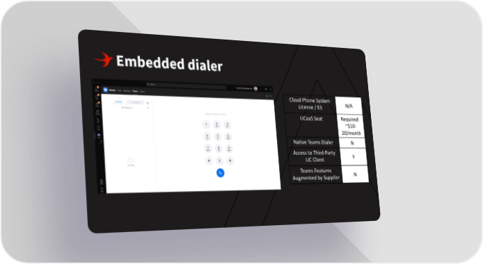 Embedded dialer Cloud Phone System N/A License / E5 UCaaS Seat Required: ~$10- 20/month Native Teams Dialer N Access to Third-Party Y UC Client Teams Features N Augmented by Supplier
