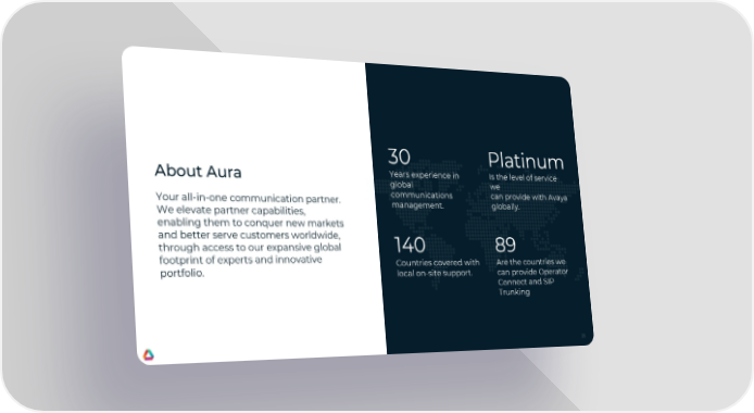30 Platinum About Aura Years experience in Is the level of service global we Your all-in-one communication partner. communications can provide with Avaya We elevate partner capabilities, management. globally. enabling them to conquer new markets and better serve customers worldwide, through access to our expansive global 140 89 footprint of experts and innovative Countries covered with Are the countries we portfolio. local on-site support. can provide Operator Connect and SIP Trunking 25