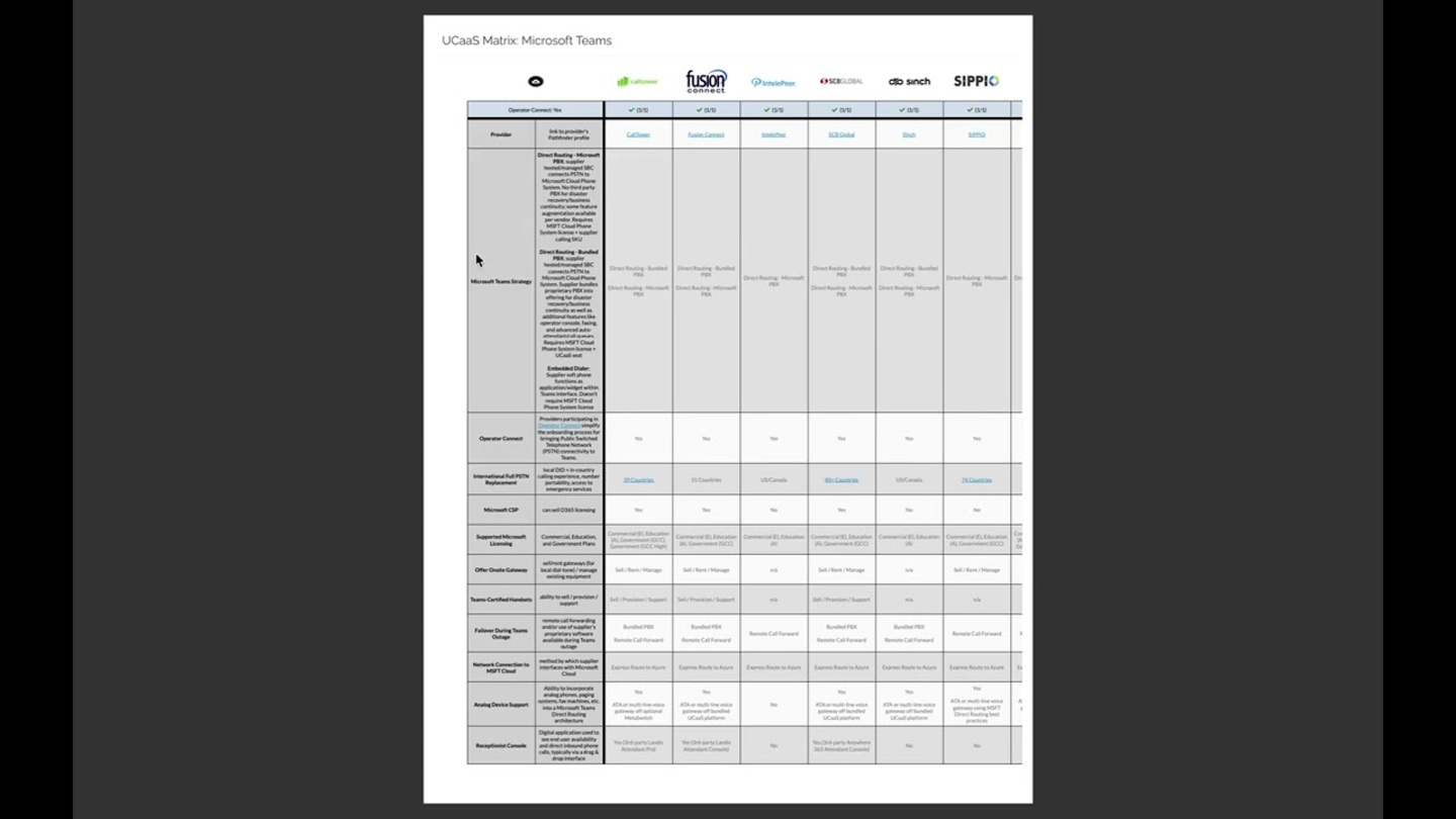 UCaaS Matrix: Microsoft Teams Operator Connect: Yes (1/1) (1/1) (1/1) (1/1) (1/1) (1/1) link to provider's Provider CallTower Fusion Connect IntelePeer SCB Global SInch SIPPIO Pathnder prole Direct Routing - Microsoft PBX: supplier hosted/managed SBC connects PSTN to Microsoft Cloud Phone System. No third party PBX for disaster recovery/business continuity; some feature augmentation available per vendor. Requires MSFT Cloud Phone System license + supplier calling SKU Direct Routing - Bundled PBX: supplier hosted/managed SBC Direct Routing - Bundled Direct Routing - Bundled Direct Routing - Bundled Direct Routing - Bundled connects PSTN to PBX PBX PBX PBX Microsoft Cloud Phone Direct Routing - Microsoft Direct Routing - Microsoft Dire Microsoft Teams Strategy System. Supplier bundles PBX PBX Direct Routing - Microsoft Direct Routing - Microsoft Direct Routing - Microsoft Direct Routing - Microsoft proprietary PBX into PBX PBX PBX PBX offering for disaster recovery/business continuity as well as additional features like operator console, faxing, and advanced auto- attendant/call queues. Requires MSFT Cloud Phone System license + UCaaS seat Embedded Dialer: Supplier soft phone functions as application/widget within Teams interface. Doesn't require MSFT Cloud Phone System license Providers participating in Operator Connect simplify the onboarding process for Operator Connect bringing Public Switched Yes Yes Yes Yes Yes Yes Telephone Network (PSTN) connectivity to Teams. local DID + in-country International Full PSTN calling experience, number 39 Countries 31 Countries US/Canada 80+ Countries US/Canada 74 Countries Replacement portability, access to emergency services Microsoft CSP can sell O365 licensing Yes Yes No Yes No No Commercial (E), Education Com Supported Microsoft Commercial, Education, Commercial (E), Education Commercial (E), Education Commercial (E), Education Commercial (E), Education Commercial (E), Education (A), Government (GCC), (A Licensing and Government Plans (A), Government (GCC) (A) (A), Government (GCC) (A) (A), Government (GCC) Government (GCC High) Go sell/rent gateways (for Offer Onsite Gateway local dial-tone) / manage Sell / Rent / Manage Sell / Rent / Manage n/a Sell / Rent / Manage n/a Sell / Rent / Manage existing equipment ability to sell / provision / Teams-Certied Handsets Sell / Provision / Support Sell / Provision / Support n/a Sell / Provision / Support n/a n/a support remote call forwarding and/or use of supplier's Bundled PBX Bundled PBX Bundled PBX Bundled PBX Failover During Teams proprietary software Remote Call Forward Remote Call Forward R Outage available during Teams Remote Call Forward Remote Call Forward Remote Call Forward Remote Call Forward outage method by which supplier Network Connection to interfaces with Microsoft Express Route to Azure Express Route to Azure Express Route to Azure Express Route to Azure Express Route to Azure Express Route to Azure Ex MSFT Cloud Cloud Ability to incorporate Yes Yes Yes Yes Yes analog phones, paging systems, fax machines, etc. ATA or multi-line voice AT Analog Device Support ATA or multi-line voice ATA or multi-line voice No ATA or multi-line voice ATA or multi-line voice into a Microsoft Teams gateway using MSFT g gateway off optional gateway off bundled gateway off bundled gateway off bundled Direct Routing Direct Routing best MetaSwitch UCaaS platform UCaaS platform UCaaS platform architecture practices Digital application used to see end user availability Yes (3rd-party Landis Yes (3rd-party Landis Yes (3rd-party Anywhere Receptionist Console and direct inbound phone No No No Attendant Pro) Attendant Console) 365 Attendant Console) calls, typically via a drag & drop interface