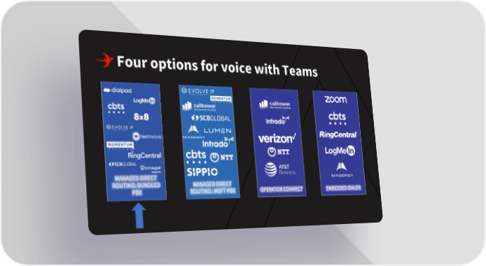 Four options for voice with Teams MANAGED DIRECT ROUTING: BUNDLED MANAGED DIRECT PBX ROUTING : MSFT PBX OPERATOR CONNECT EMBEDDED DIALER