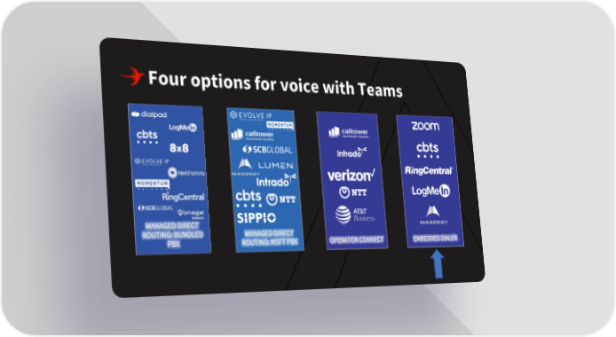 Four options for voice with Teams MANAGED DIRECT ROUTING: BUNDLED MANAGED DIRECT PBX ROUTING: MSFT PBX OPERATOR CONNECT EMBEDDED DIALER