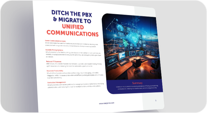 UCaaS can help businesses save money and improve efficiency by streamlining communication, reducing maintenance costs, and enhancing productivity. Summary DITCH THE PBX & MIGRATE TO UNIFIED COMMUNICATIONS Lower Communication Costs: UCaaS eliminates the need for traditional phone lines and hardware, reducing costs associated with long-distance calls and maintenance of on-premises equipment. Scalable Pricing Options: UCaaS providers offer flexible pricing plans based on the number of users and features needed, allowing businesses to only pay for what they use and quickly scale up or down as needed. Reduced IT Expenses: With UCaaS, the provider handles maintenance, upgrades, and troubleshooting, freeing up IT resources and reducing the need for dedicated support personnel. Improved Productivity: UCaaS offers features such as video conferencing, instant messaging, and mobile integration, which increase collaboration and efficiency among employees and ultimately save time and money. Centralized Management: UCaaS provides a centralized platform for managing all communication tools, simplifying administration, and reducing the need for multiple vendors and disparate systems. 5 www.readynine.com