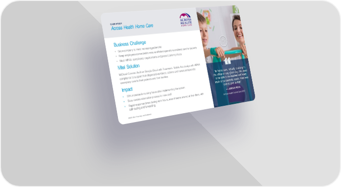 CASE STUDY Across Health Home Care Business Challenge • Grow company to meet increasing patient list • Keep employees connected to ensure efficient operations and best care for patients • Meet HIPAA compliance requirements and protect patient privacy Case Study Mitel Solution MiCloud Connect built on Google Cloud with Teamwork: Mobile-first design with HIPAA Image compliance to support their dispersed workforce, admins and nurses and provide exemplary care to their patients and their families “In home care, nobody is sitting in Impact the office on any given day. We need to be able to be reached and keep • 50% increase in nursing hours after implementing the system track of our patients easily. Mitel was • Easy remote orientation process for new staff able to give us that.” • Rapid response times during work hours, even if teams are not at their desk, with —JESSICA REVA call routing and forwarding Across Health Home Care CEO ©2019 Mitel. Proprietary and Confidential.